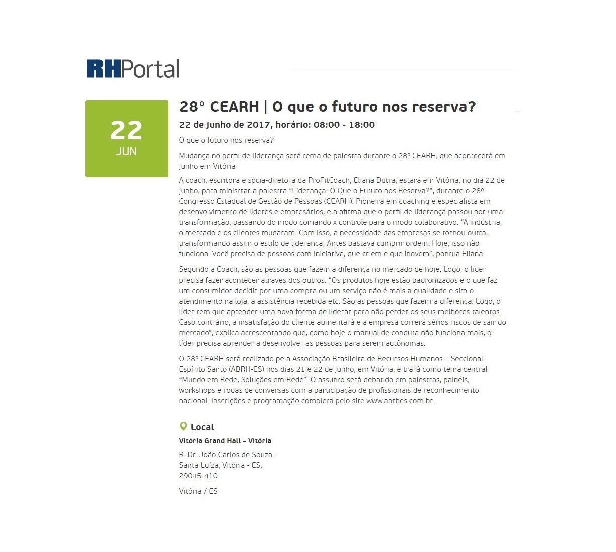 19/06/2017 – A Associação Brasileira de Recursos Humanos – Seccional Espírito Santo (ABRH-ES) realizará o 28º Congresso Estadual de Gestão de Pessoas (CEARH) nos dias 21 e 22 de junho, no Grand Hall Vitória, em Santa Luiza, e trará como tema central “Mundo em Rede, Soluções em Rede”.