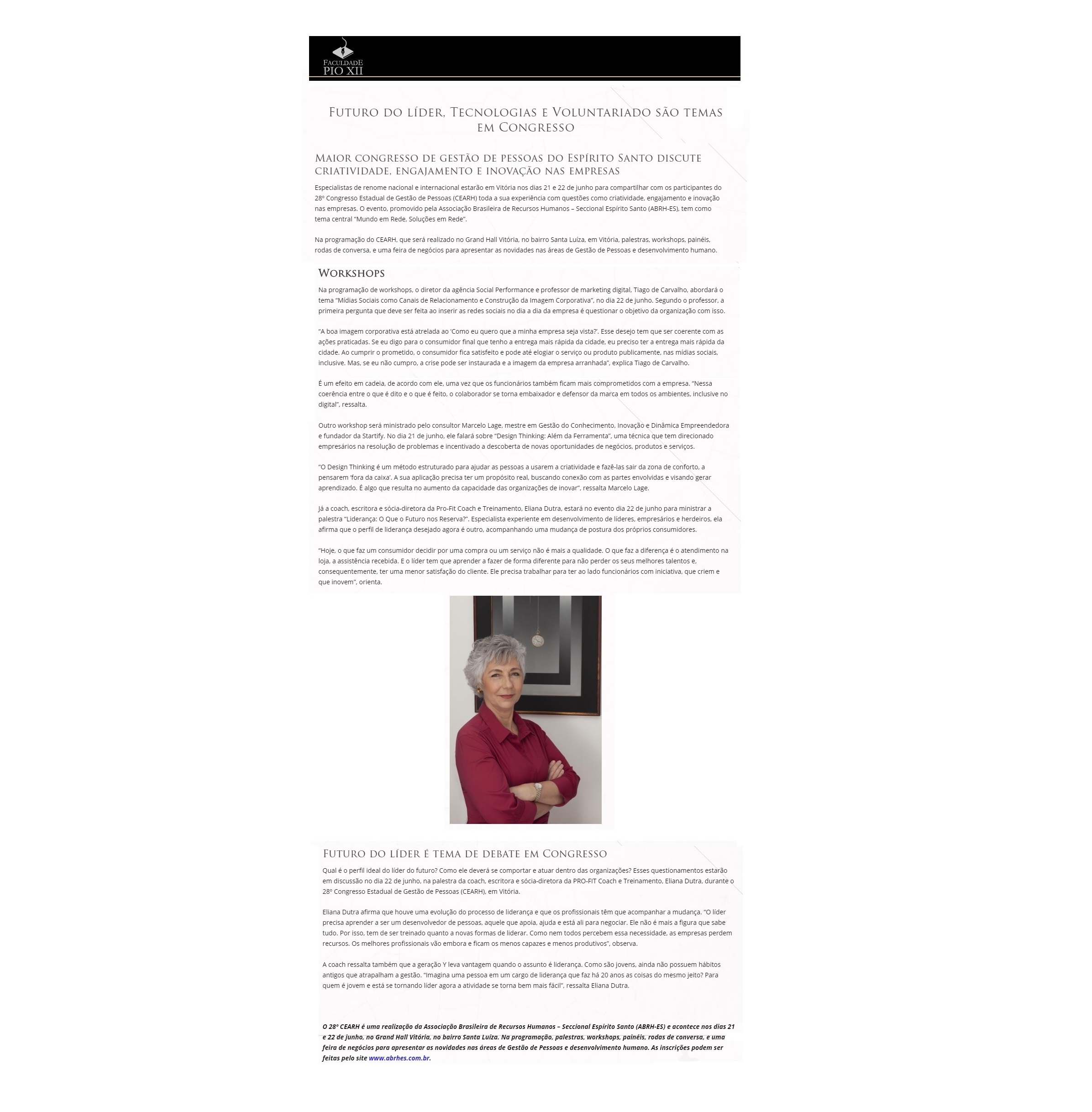 16/05/2017 – Maior congresso de gestão de pessoas do Espírito Santo discute criatividade, engajamento e inovação nas empresas Especialistas de renome nacional e internacional estarão em Vitória nos dias 21 e 22 de junho para compartilhar com os participantes do 28º Congresso Estadual de Gestão de Pessoas (CEARH) toda a sua experiência com questões como […]
