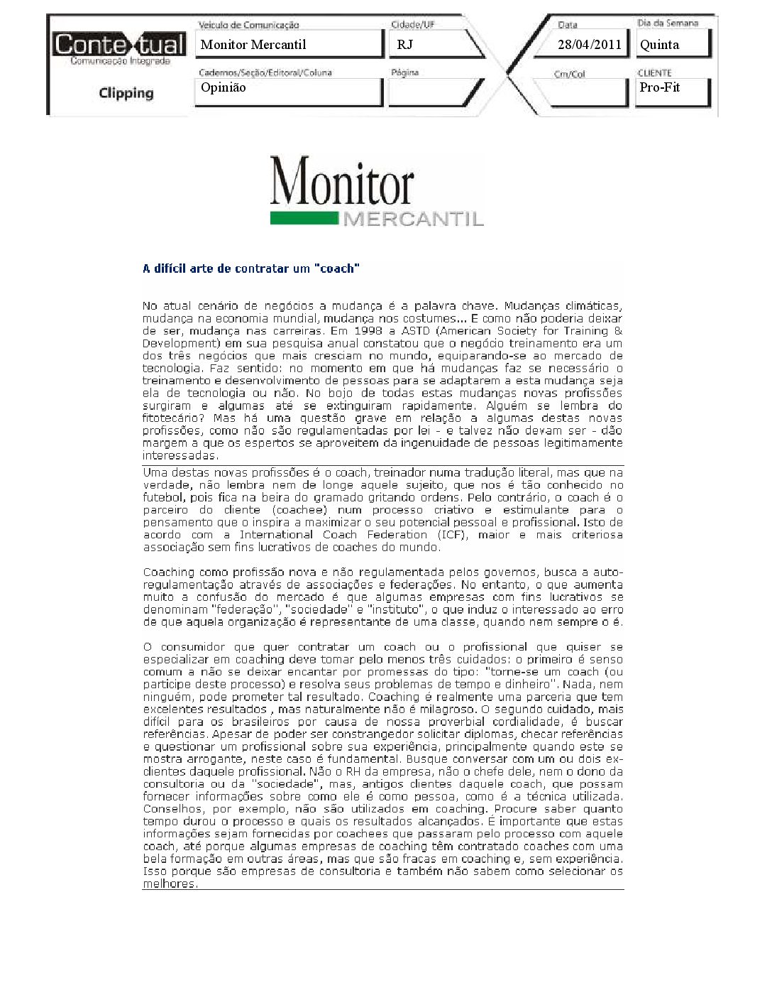 Monitor Mercantil – A difícil arte de contratar um coach – 28/04/2011