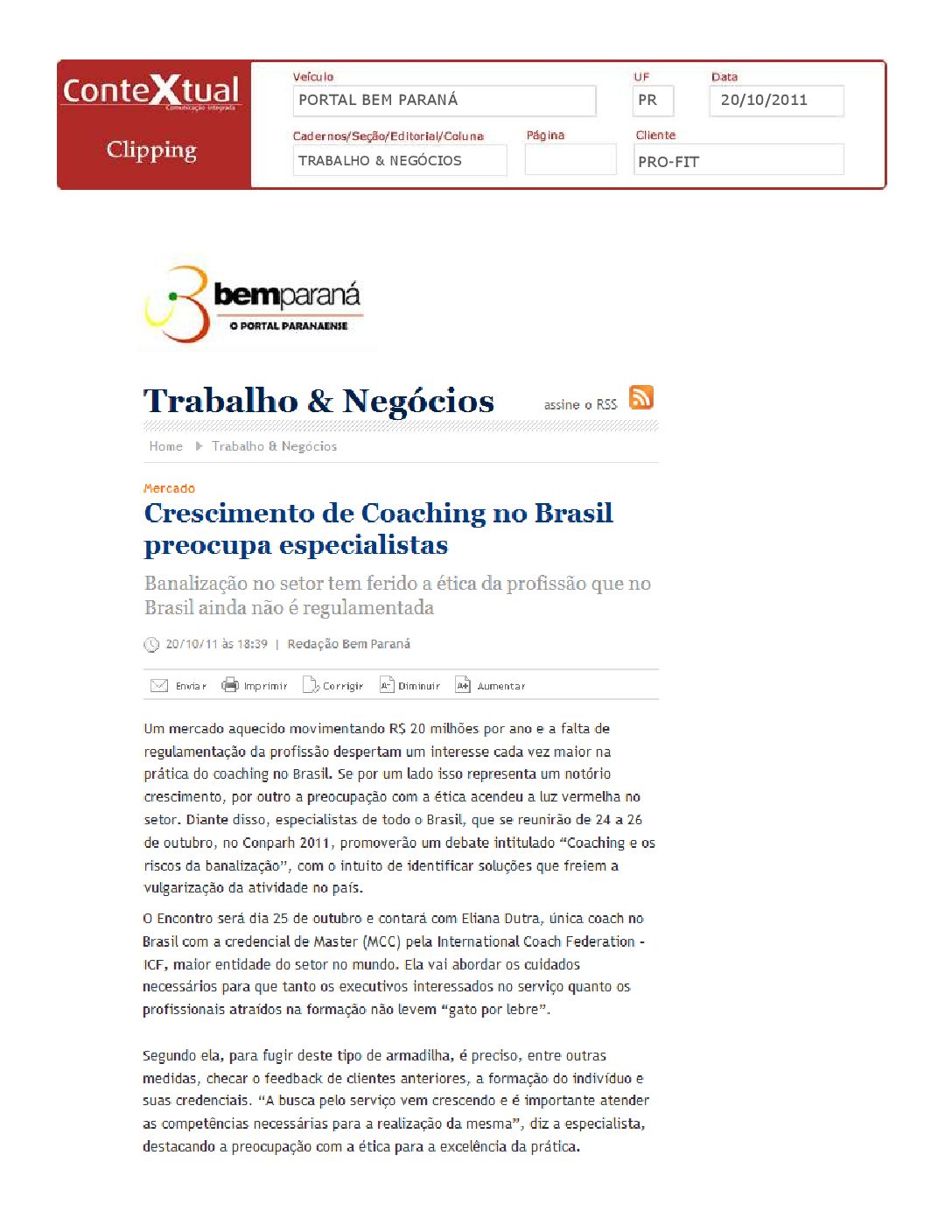 Portal Bem Paraná – Crescimento de coaching no Brasil preocupa especialistas – 20/10/2011