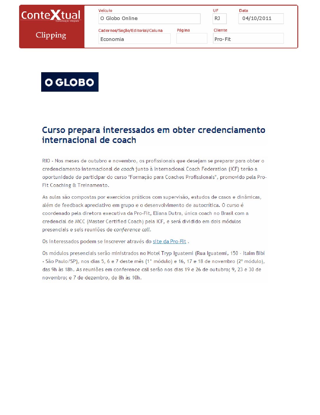 O Globo Online – Curso prepara interessados em obter credenciamento internacional de coach – 04/10/2011