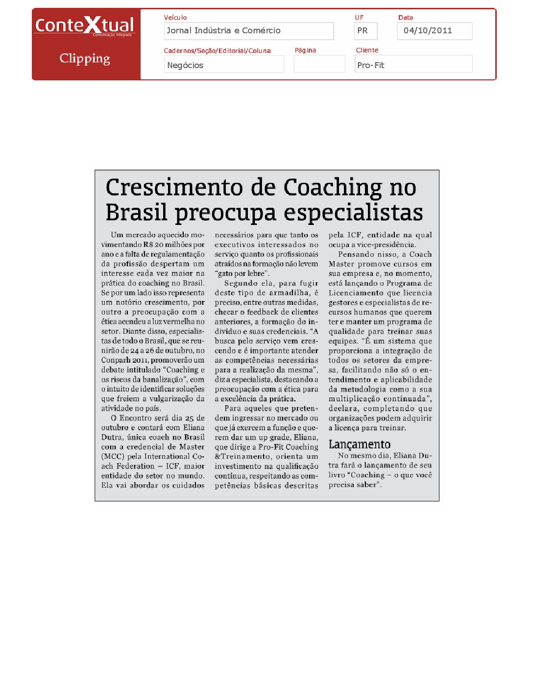 Jornal Indústria e Comércio – Crescimento de coaching no Brasil preocupa especialistas – 04/10/2011