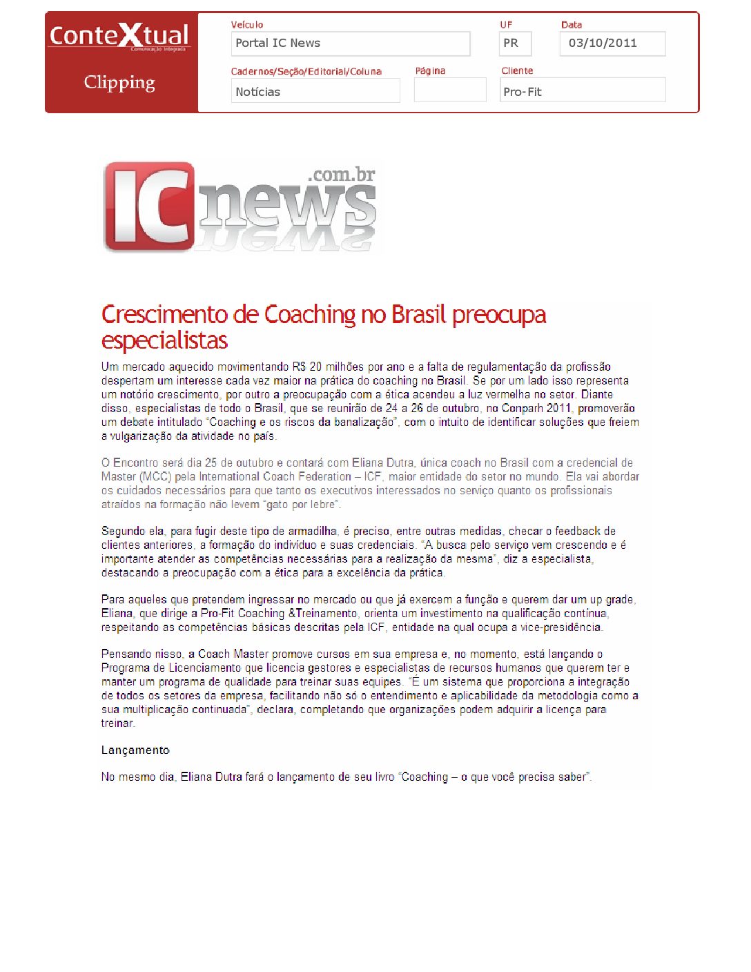 Portal IC News – Crescimento de coaching no Brasil preocupa especialistas – 03/10/2011