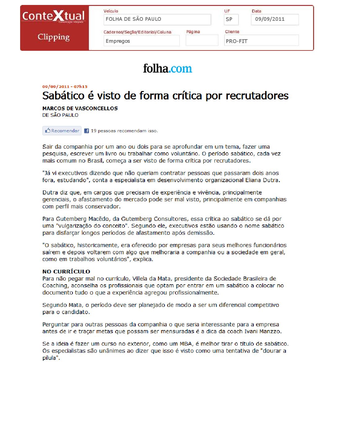 Folha de São Paulo – Sabático é visto de forma crítica por recrutadores – 09/09/2011