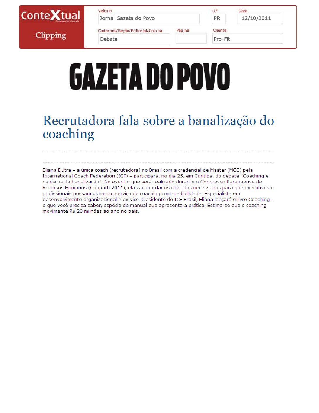 Jornal Gazeta do Povo – Recrutadora fala sobre a banalização do coaching – 12/10/2011