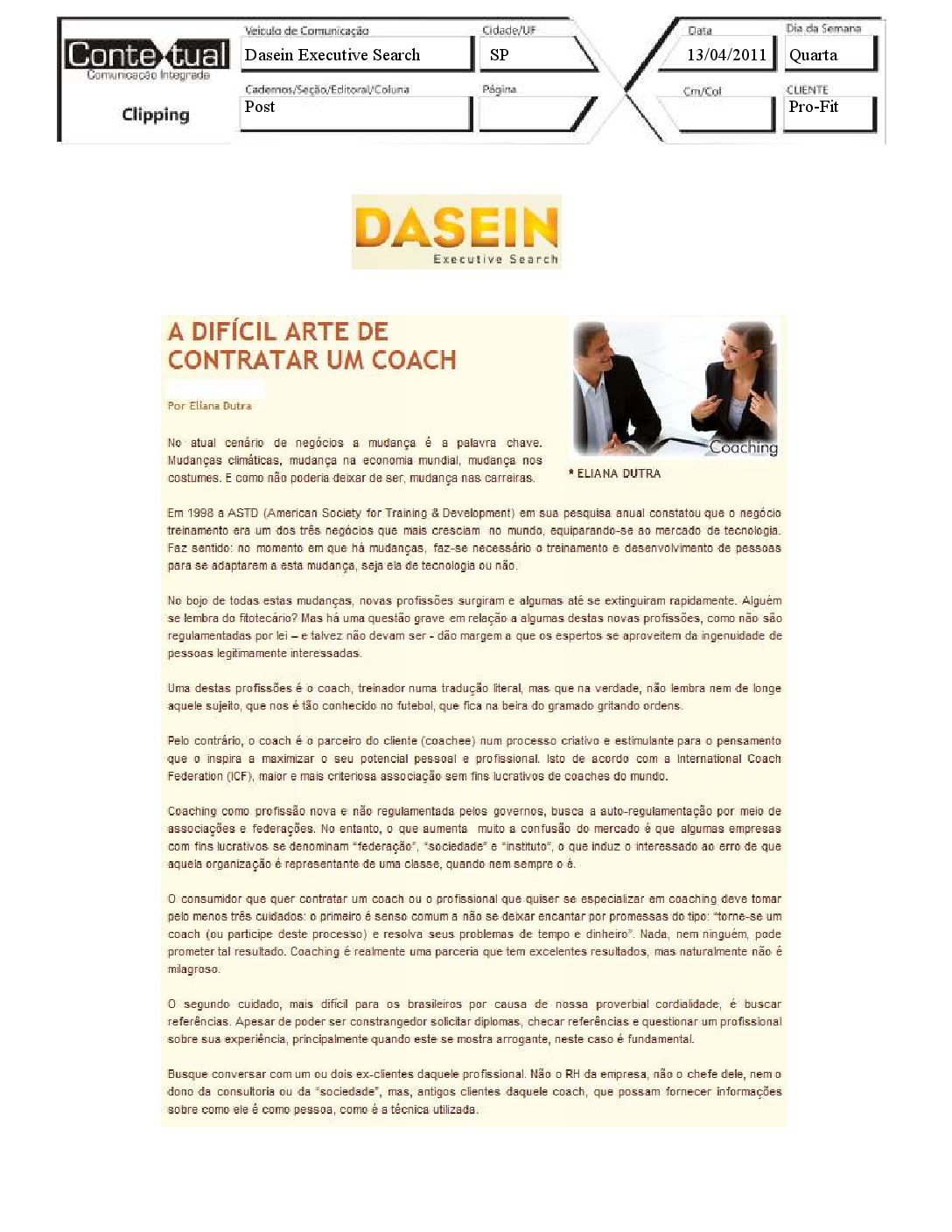 Dasein Executive Search – A difícil arte de contratar um coach – 13/04/2011