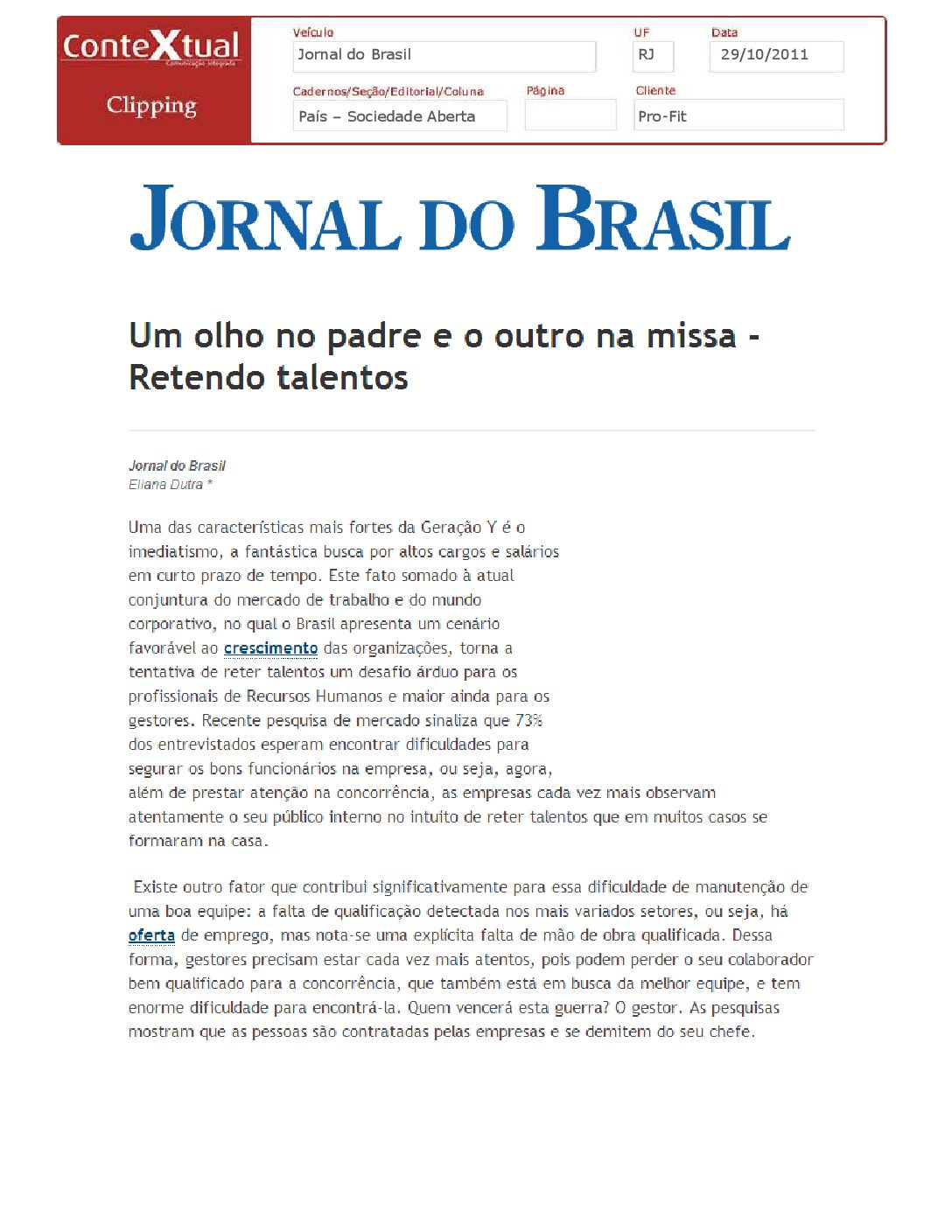 Jornal do Brasil – Um olho no padre e outro na missa – 29/10/2011