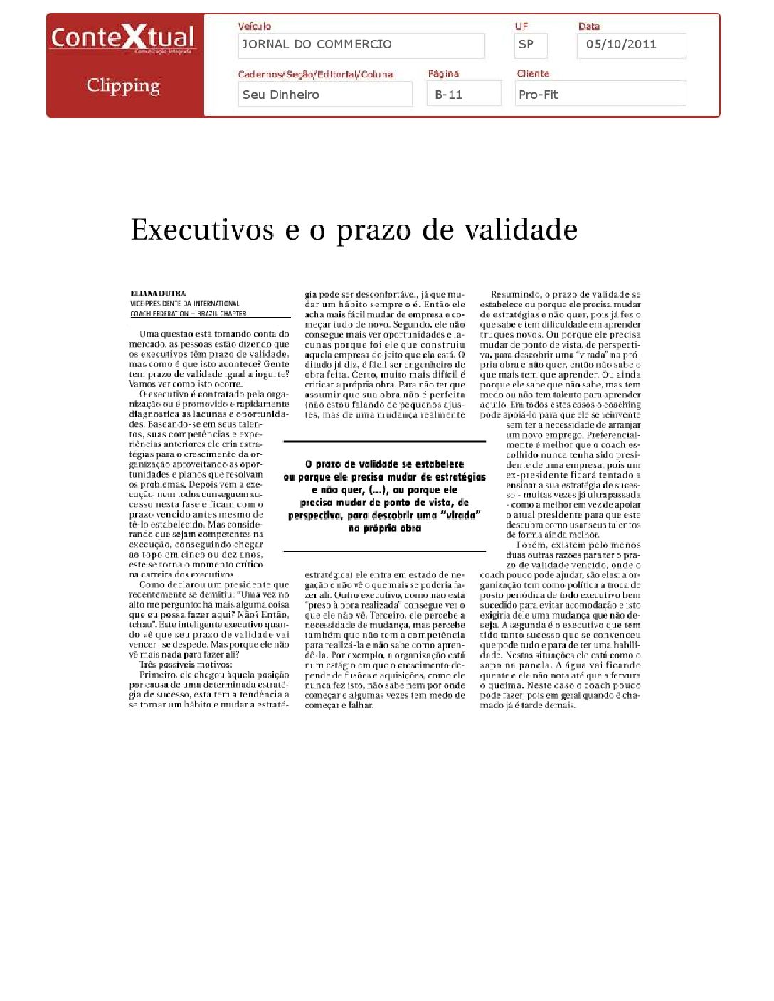 Jornal do Commercio – Executivos e o prazo de validade – 05/10/2011