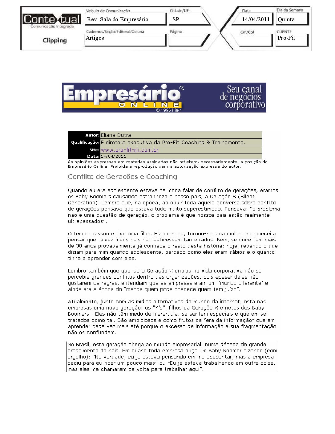 Revista Sala do Empresário – Conflito de gerações e coaching – 14/04/2011