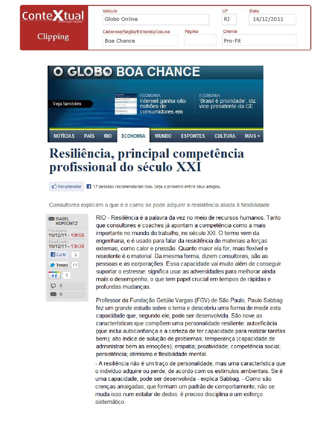 Globo online – Resiliência, principal competência profissional do século XXVI – 16/12/2011