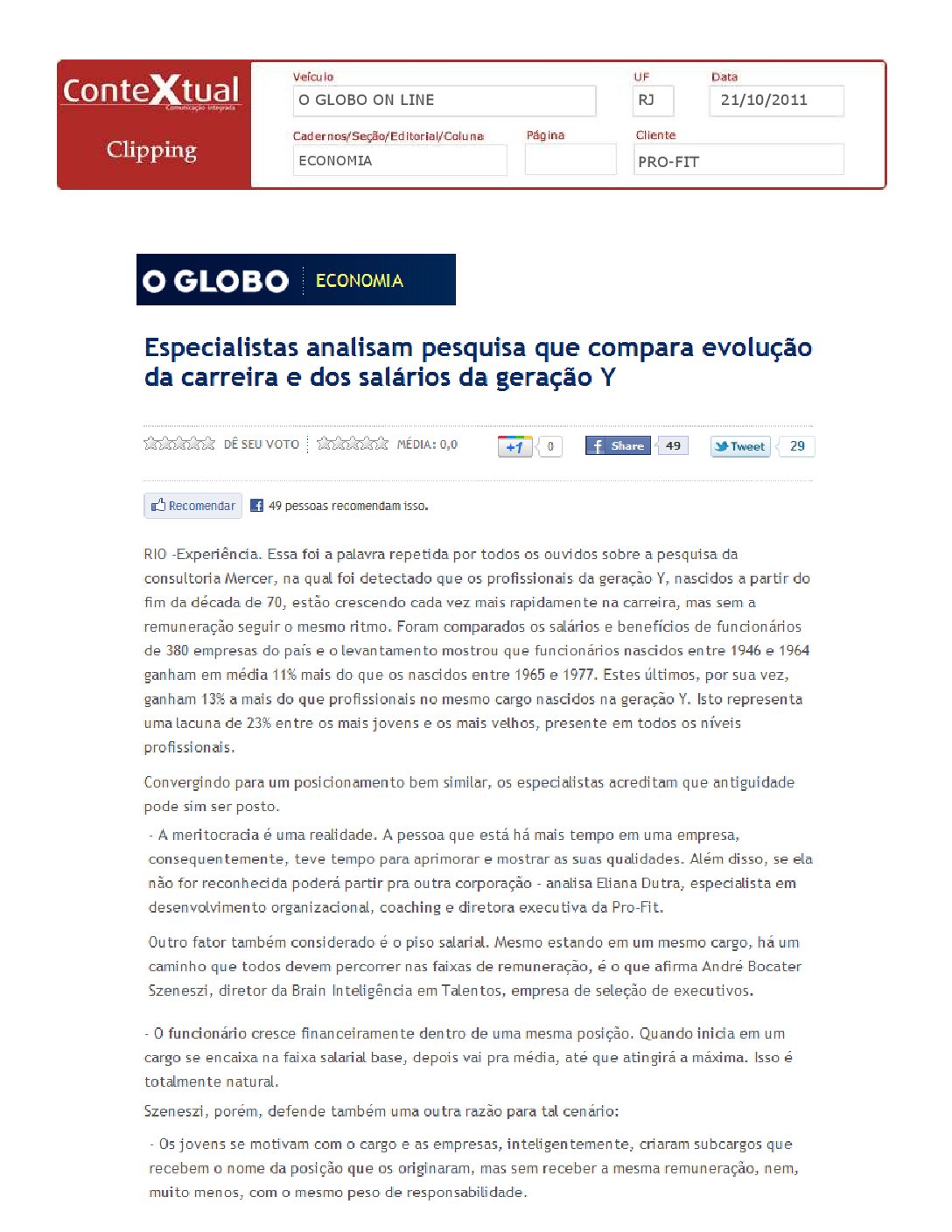O Globo On Line – Especialistas analisam pesquisas que compara evolução da carreira e dos salários da geração Y – 21/10/2011