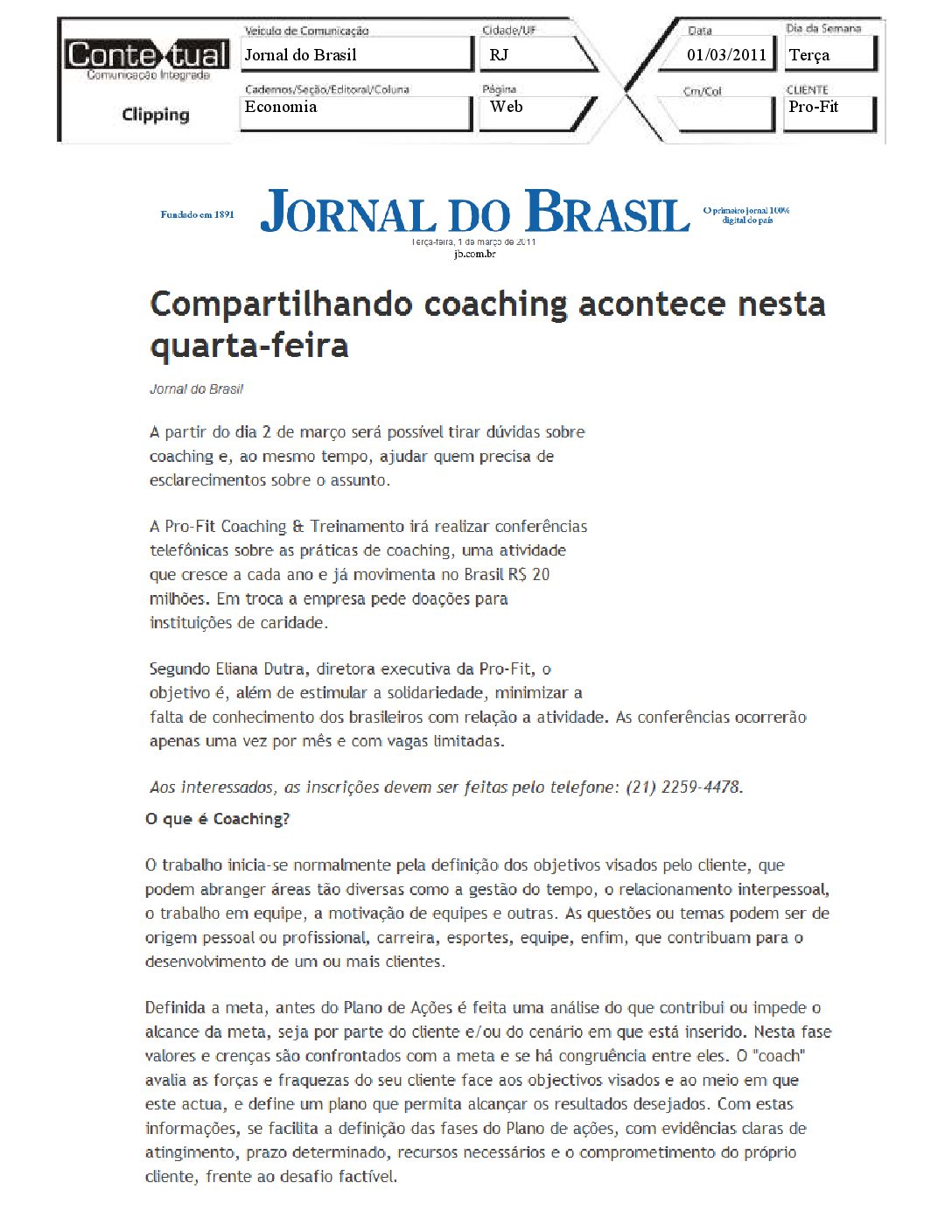 Jornal do Brasil – Compartilhando coaching acontece nesta quarta feira – 01/03/2011