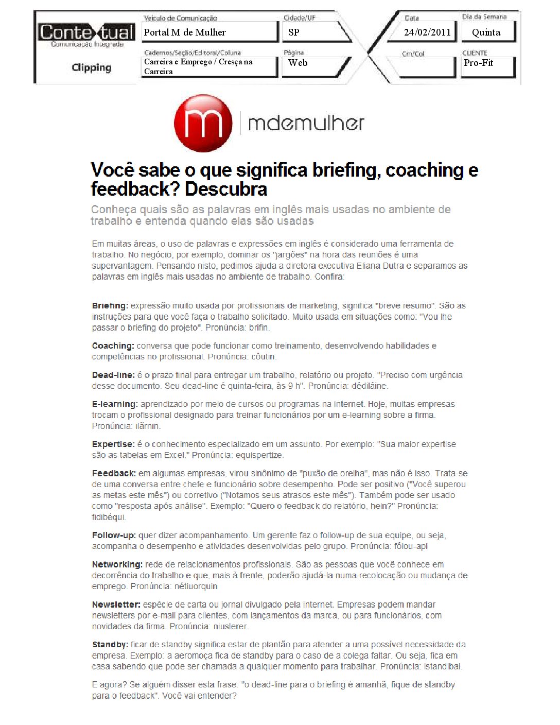 Portal M de Mulher – Você sabe o que significa briefing, coaching e feedback? Descubra – 24/02/2011