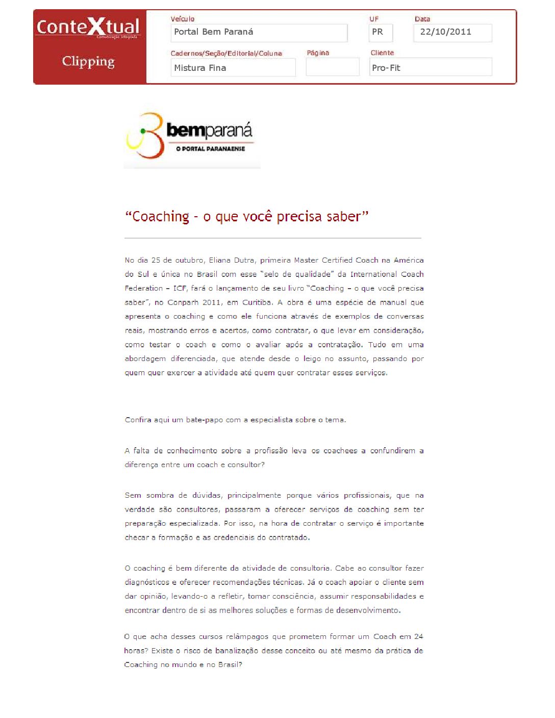Portal Bem Paraná – Coaching – o que você precisa saber – 22/10/2011