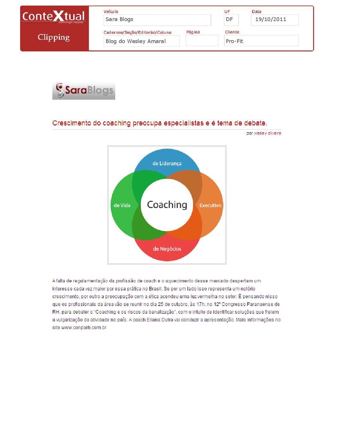 Sara Blogs – Crescimento do coaching preocupa especialistas e é tema de debate – 19/10/2011