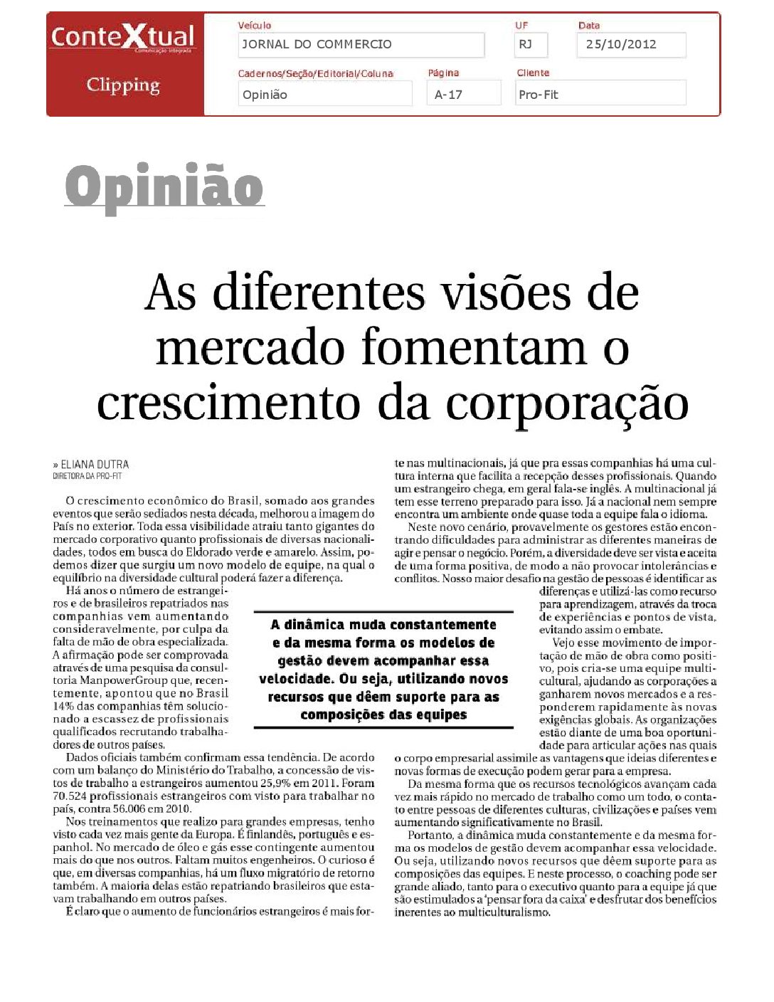 Jornal do Commercio – As diferentes visões de mercado fomentam o crescimento da corporação – 25/10/2012