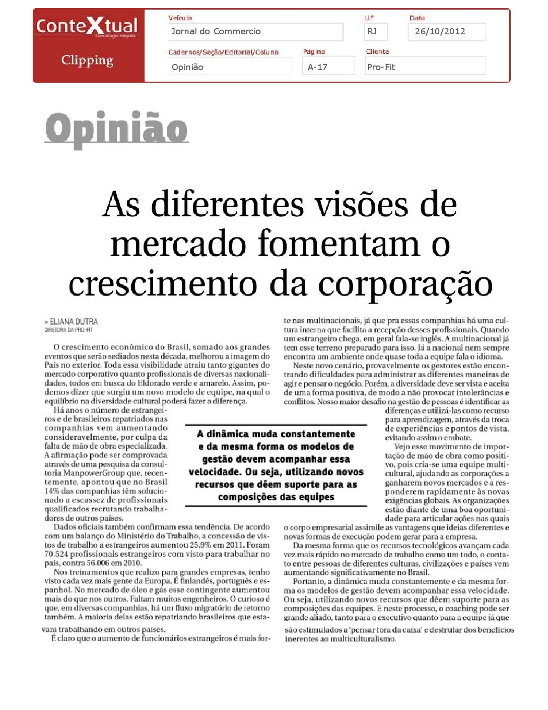 Jornal do Commercio – As diferentes visões de mercado fomentam o crescimento da corporação – 26/10/2012